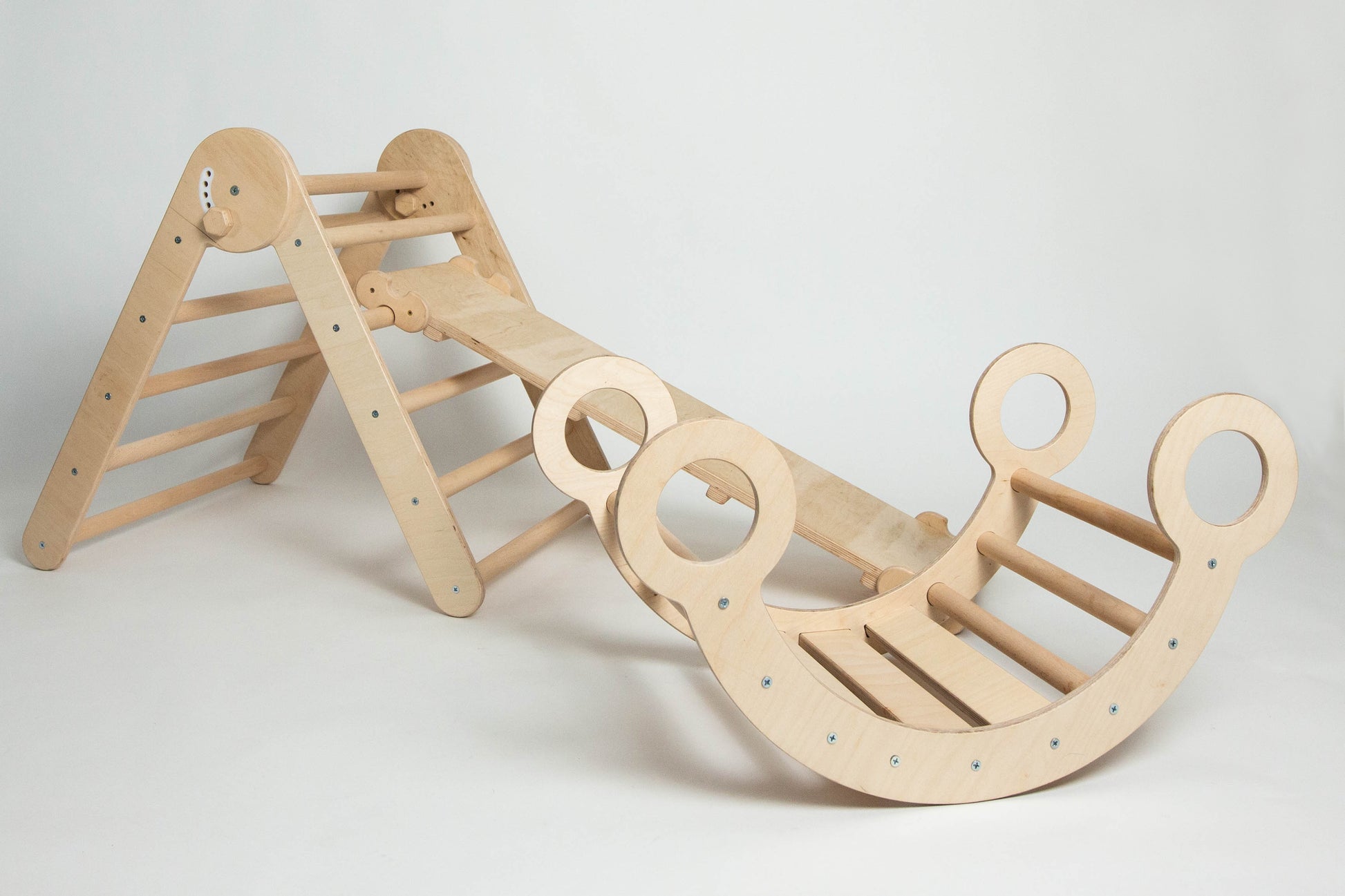 This set contains a climbing arch and a small Triangle, and you can add a ladder ramp, or sliding ramp, or sliding and ladder in 1 ramp (2 in 1) or choose 2 separate ramps - ladder ramp and sliding board.