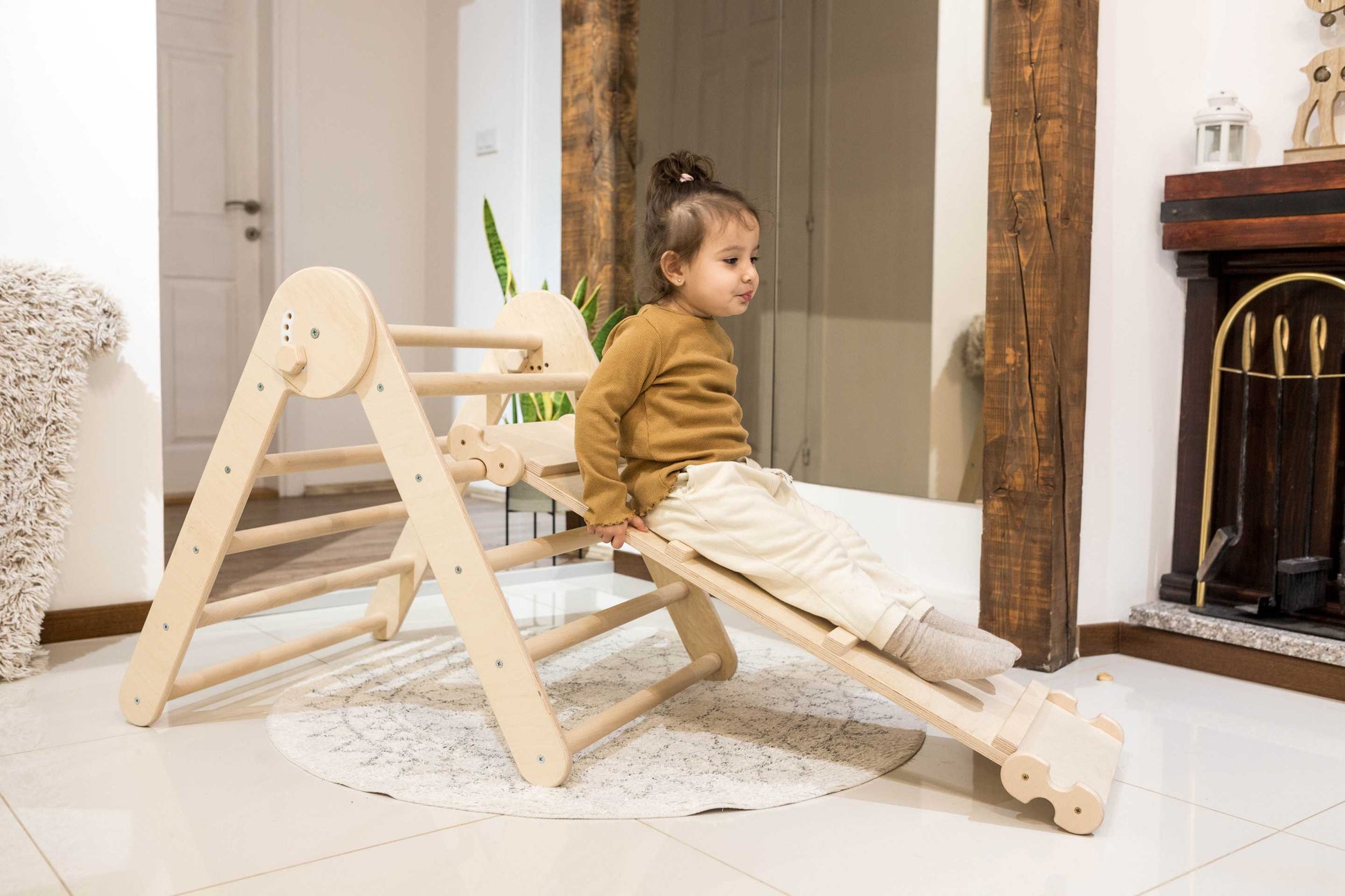 Climber with a ramp engages the child's visual perception, measuring handgrip strength, body rotation, and crossing the midline of the body, adjusting tone to maintain the desired posture, coordination of arm and leg movements, which is very important, and great also for vestibular stimulation, that is, activation of the sense of balance.